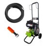 Possui mangueira com trama de aço que suporta alta pressão e alça de transporte.