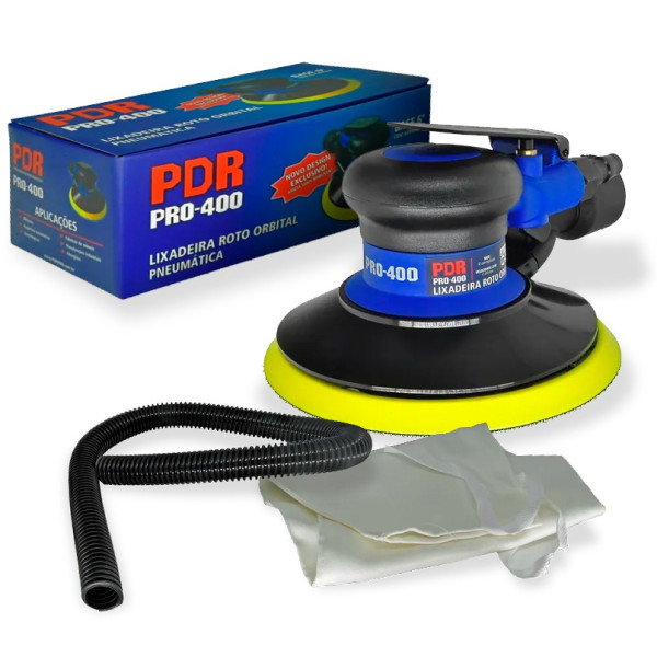 Lixadeira Roto Orbital Pneumática PRO‑400 PDR, uma lixadeira pneumática com aspiração e base de 6 polegadas, indicada para lixamento, acabamento e polimento em vários materiais. O movimento roto‑orbital ajuda a reduzir marcas repetitivas e melhora o acabamento final, o sistema de aspiração integrado melhora bastante a limpeza e conforto comparado a lixadeiras sem coleta de pó e é deal para quem precisa de uma ferramenta pneumática versátil em oficinas ou ambiente profissional.