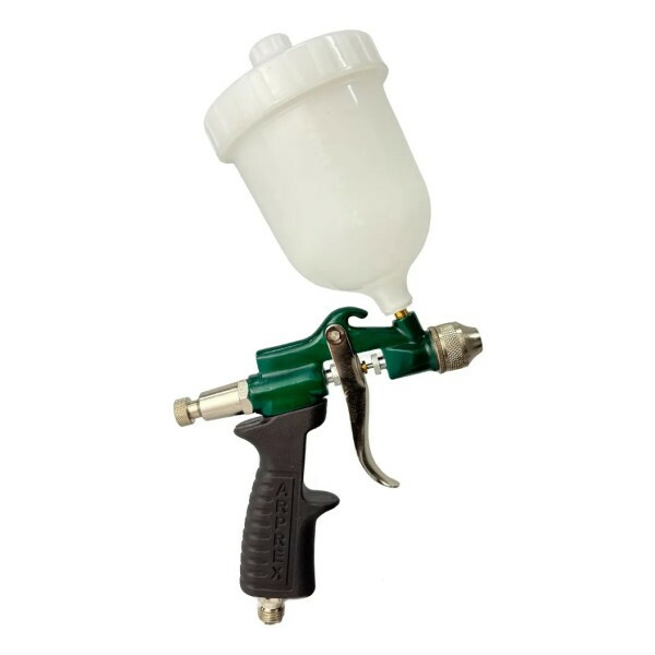 A Pistola de Pintura Arprex Modelo 5X é uma ferramenta pneumática de alimentação por gravidade (caneca na parte superior), também chamada informalmente de “aerógrafo industrial leve”. Ela utiliza ar comprimido para pulverizar tinta, oferecendo bom controle e acabamento uniforme em pinturas delicadas ou de pequeno porte.